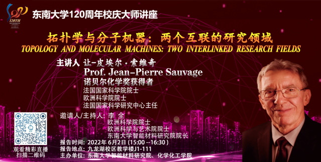 Sauvage教授是著名的法国化学家,斯特拉斯堡大学终生名誉教授,入选法国国家科学院院士、欧洲科学院院士、法国国家科学研究中心主任等。Sauvage教授主要从事无机配位化学,超分子化学,索烃,分子自组装以及分子纳米系统的研究,是超分子拓扑化合物研究的开拓者。他开发了分子识别与组装过程中模板合成机械互锁型分子(如轮烷和索烃)的方法,大力推动了该领域的发展。因在分子机器设计与合成方面的突出贡献,与J. Fraser Stoddart教授、Bernard L. Feringa教授一同获得了2016年诺贝尔化学奖。Sauvage教授由于其杰出的科研工作,先后获得法国科学研究中心(CNRS)铜奖(1978)、法国科学研究中心(CNRS)银奖(1988)、Izatt-Christensen奖(1991)、Prelog金奖(1994)、Nessim Habif世界大学奖(1998)、法国化学会Pierre Süe奖(2005)、西班牙皇家化学会Sabatier奖(2005)、Woodward卟啉化学奖(2008),还被授予荣誉军团骑士勋章。