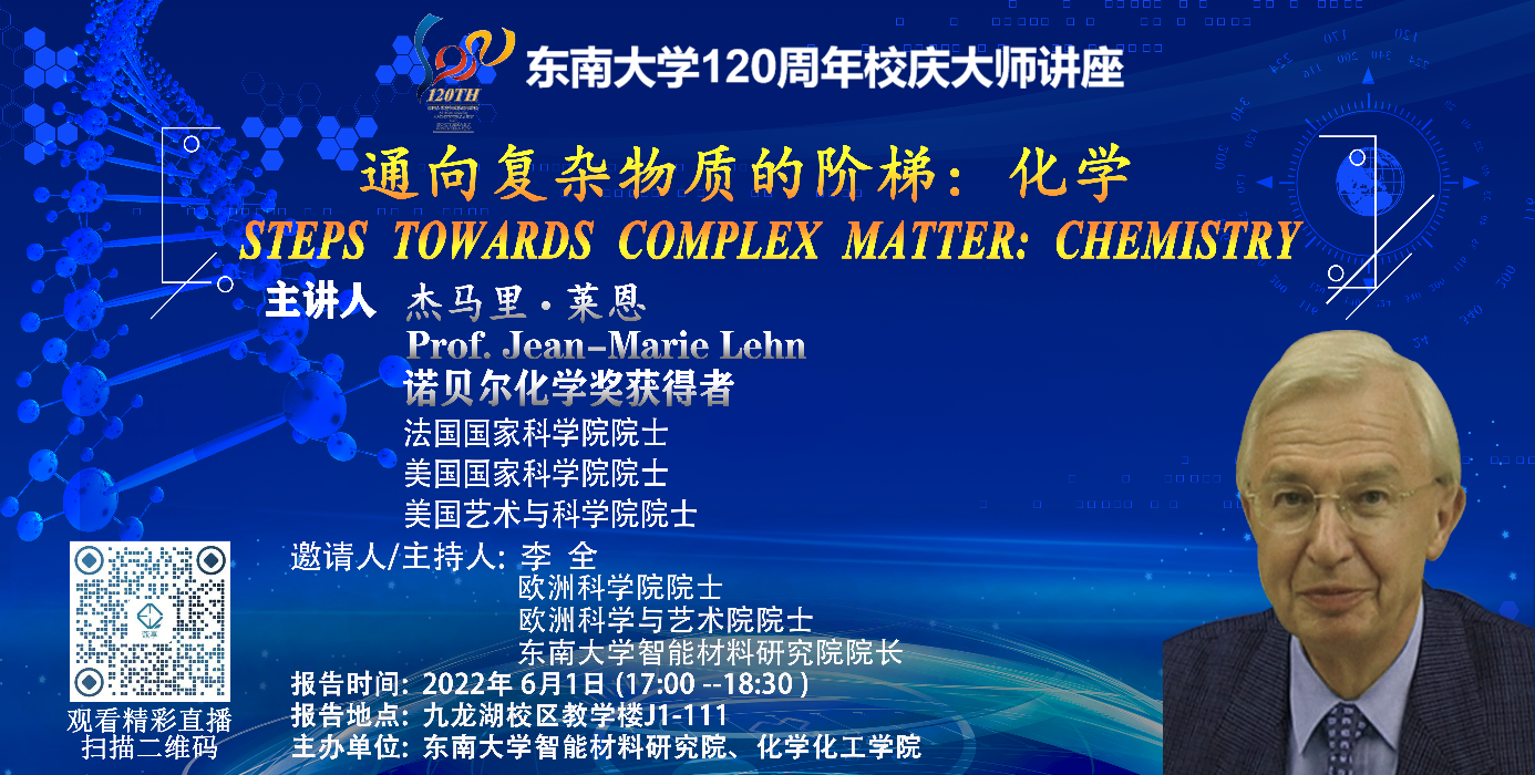 Lehn教授是著名的化学家、超分子化学家,法国国家科学院院士、美国国家科学院院士、美国艺术与科学院院士等。1987年与D.J. CramC.J. Pedersen一起,因发展了具有高度选择性的结构特异性相互作用的分子获得了诺贝尔化学奖。之后的二十多年里,Lehn教授在全世界倡导超分子化学的概念。与分子化学不同,超分子化学是关于分子间相互作用和分子聚集体的化学。目前,超分子化学已经形成了自己的概念和体系,成为化学的一个重要分支。同时它也提供了一种超越分子层次的思维方法,推动着其它相关学科的进步。Lehn教授凭借在此领域的杰出贡献,被尊称为超分子化学之父