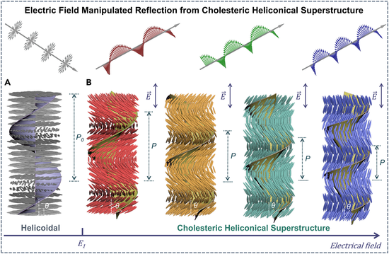 探寻动态可控新型光子器件的前沿发展与应用潜能,其核心在于构筑外场可控的先进光子材料与组装序构。具有刺激-响应的液晶材料在手性环境中可自组装成百纳米量级的螺旋超结构,呈现出独特的结构与光相互作用,在多自由度动态光场调控等方面展现出巨大的应用潜力。通过低电场操控液晶螺旋结构实现其光子带隙的宽动态范围调制,始终是工程化应用的最佳选择。然而,由于常规螺旋组装中液晶介电各向异性与分子扭曲之间的相互竞争,导致光子带隙调制始终面临着调谐范围狭窄、驱动电场高、光学效率低等难题。