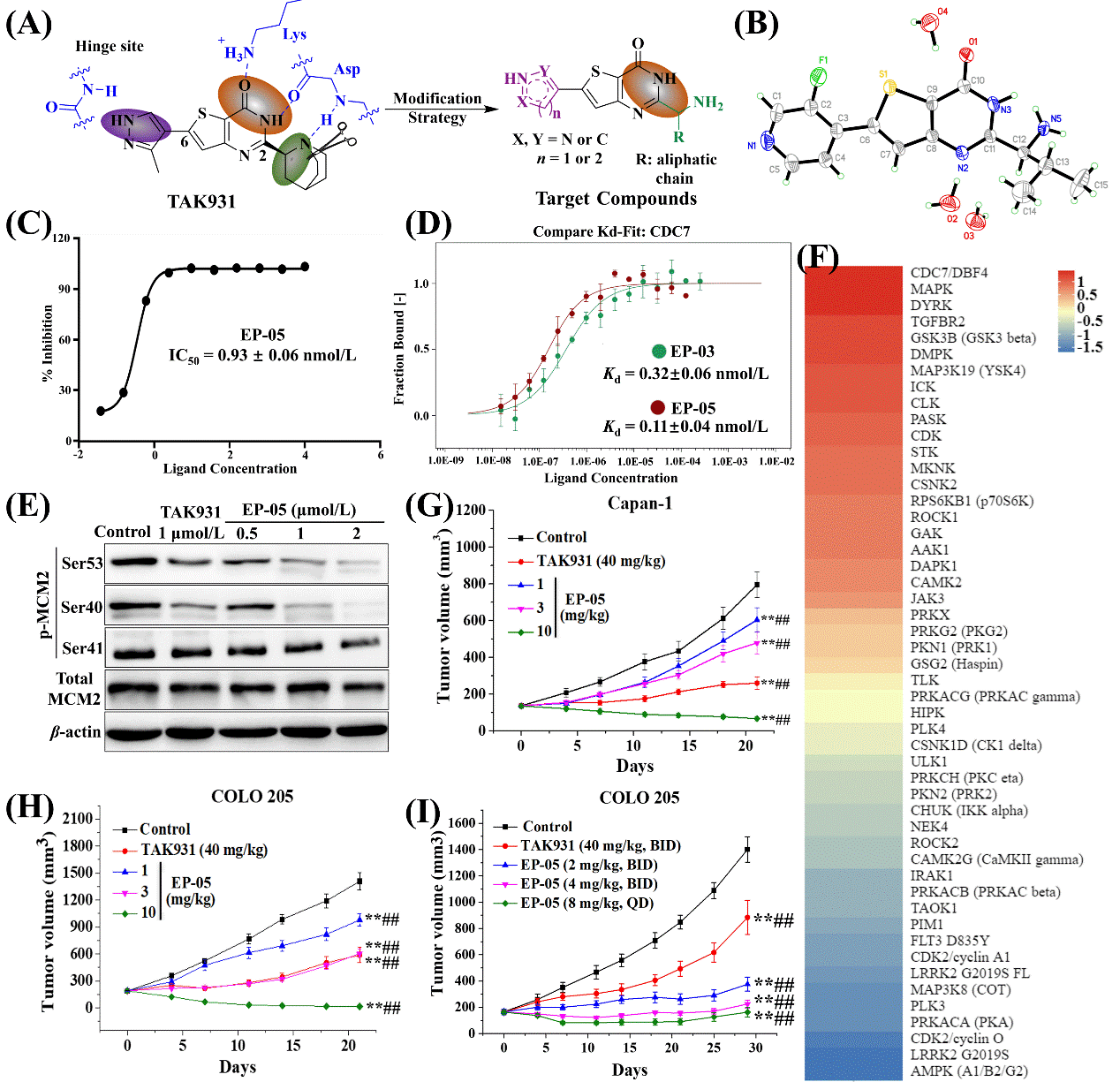 通过剖析现有CDC7抑制剂TAK931结构与活性之间的关系及其在临床试验中凸显的问题,结合计算机辅助药物设计,对其进行多轮结构优化,最终发现候选药物EP-05。体外抗肿瘤活性研究结果表明,EP-05对CDC7酶具有强效的抑制作用和高度的选择性,其IC50值为0.93 nM,与CDC7酶之间的Kd值为0.11 nM。在激酶谱筛选中,EP-05对CDC7酶也表现出高效的抑制作用。EP-05对34种不同的癌细胞均呈现强效的细胞毒性,IC50值达到纳摩级,但对正常细胞hERG和HUVEC的IC50值大于30 μM。体内研究结果表明,EP-05具有优越的药代动力学,其在小鼠、大鼠、比格犬、猴子和人肝微粒体中半衰期(t1/2)均超过48 min。在小鼠和大鼠中无论口服还是静脉给药都具有良好的药代参数,生物利用度分别达到45.29%和51.26%。在Capan-1和COLO 205异种移植瘤小鼠模型中,EP-05均表现出比阳性对照TAK931更为强效的抗癌活性,在每天口服8-10 mg/kg的剂量下对肿瘤生长的抑瘤率均超过90%。结果表明,EP-05是一种高效、低毒、具有良好药代参数和强效的CDC7抑制剂,具有潜在的临床应用前景。