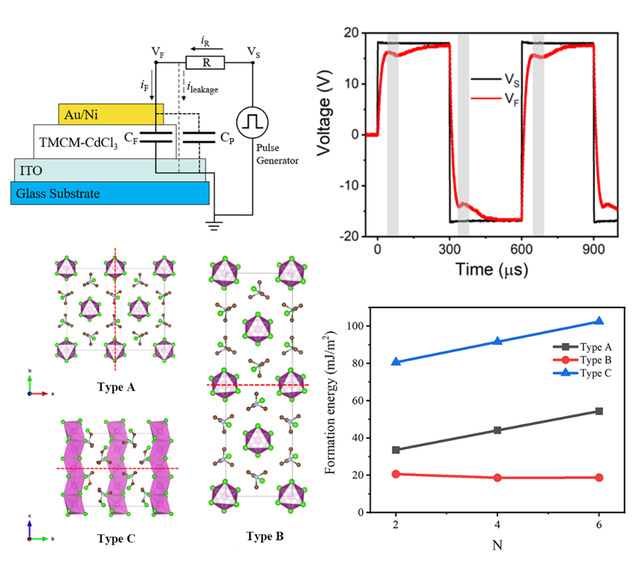分子铁电体作为铁电体中一种重要的材料类型,具有易制备、机械柔性、加工温度低、结构可调等优势。分子铁电在性能和功能方面近年来都得到了迅速发展,但对于分子铁电体的NC效应仍然未有探索。这项研究系统分析了分子铁电体在NC效应方面的优势,并在分子铁电电容器的NC效应研究方面取得了突破性进展。基于分子铁电材料三甲基氯甲基三氯化镉(II)铵(TMCM-CdCl3)薄膜搭建的分子铁电电容器件,实现了与传统的无机HfO2基铁电体相当的NC响应。此外,结合压电响应力显微镜(PFM)和理论计算,分析TMCM-CdCl3具有独特的畴壁结构以及高的畴壁形成能,这表明TMCM-CdCl3在数控器件中将具有优异的性能。